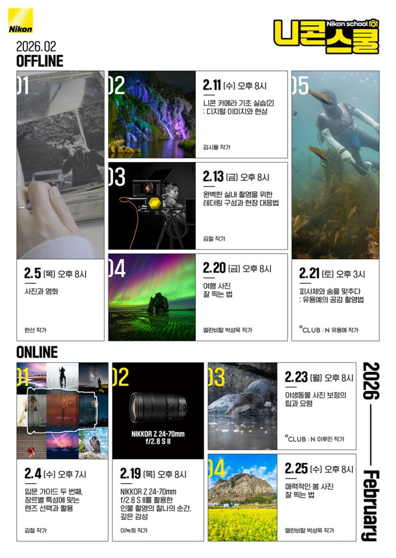 광학기기 전문기업 니콘이미징코리아(대표 정해환)는 26년2월 온오프라인 니콘스쿨 총 9개 강의를 공개했다.