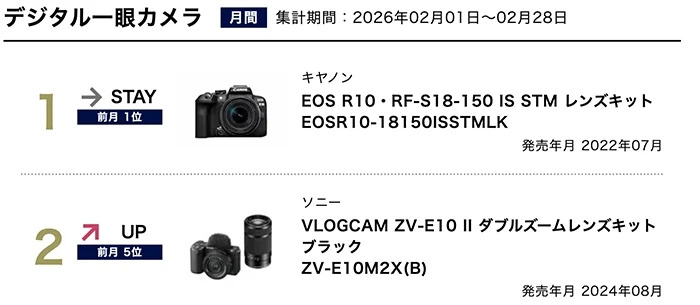 - 1인 미디어의 힘: 소니는 ZV-E10 시리즈를 각기 다른 패키지로 순위에 올리며 영상 시장의 절대 강자임을 입증했다.