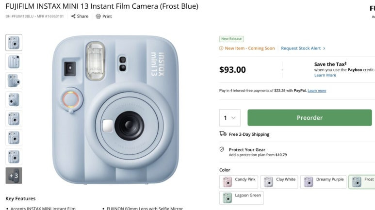 인스탁스 미니 13의 북미 출시 가격은 93.95달러(한화 약 12만 원대)로 책정되었으며, 오는 6월 말부터 글로벌 판매가 시작될 예정이다. 국내 출시 일정 및 가격은 추후 후지필름 코리아를 통해 확정될 것으로 보인다.
