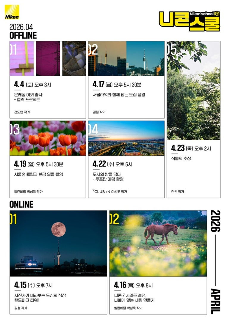공식 유튜브 채널을 통한 온라인 강의 2개도 병행된다. 4월 15일 ‘사진가가 바라보는 도심의 심장, 랜드마크 타워!’ 강의에서는 남산타워나 광화문 등 도심 랜드마크를 감성적인 색감으로 담아내는 촬영 기법을 소개한다. 이어 16일 ‘니콘 Z 시리즈 설정, 나에게 맞는 세팅 만들기’ 강의에서는 초점, 노출, 색감 등 카메라 입문자를 위한 촬영 핵심 노하우와 개인화된 설정법을 소개할 계획이다.